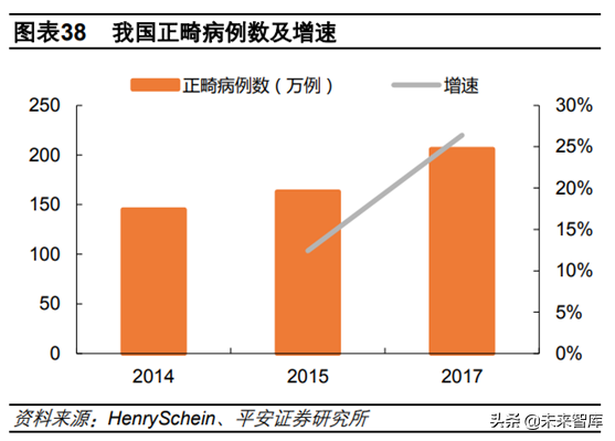 隨著居民收入提升,口腔消費(fèi)觀念改良,過去幾年種植和正畸量保持了快速增長。2017年我國種植牙數(shù)量達(dá)到196萬顆,同比增長近40%,若單顆按10000元計(jì)算,則2017年我國種植牙市場規(guī)模約200億元;而根據(jù)HenrySchein的數(shù)據(jù),2015年我國正畸病例有163萬例,同比增長12.4%,若按此增速計(jì)算,則2017年我國正畸病例大約206萬例,每例按12000元計(jì)算,則我國正畸市場規(guī)模在250億左右。