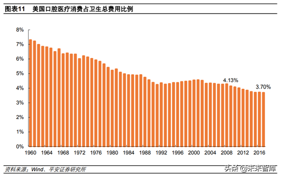 我國潛在口腔醫(yī)療市場在2000億以上。2017年美國口腔醫(yī)療消費(fèi)占衛(wèi)生總費(fèi)用的比例為3.70%,但美國衛(wèi)生總費(fèi)用的持續(xù)增長導(dǎo)致口腔醫(yī)療消費(fèi)占比呈下降趨勢。美國口腔醫(yī)療市場規(guī)模增速2009年開始低于5%,我們認(rèn)為進(jìn)入成熟期,當(dāng)年口腔消費(fèi)占衛(wèi)生總費(fèi)用的比例為4.13%,按此比例計(jì)算,目前國衛(wèi)生總費(fèi)用對應(yīng)的內(nèi)口腔醫(yī)療市場規(guī)模達(dá)到2172億元。而考慮到我國衛(wèi)生費(fèi)用的持續(xù)增長,我國口腔醫(yī)療市場應(yīng)遠(yuǎn)不止如此。