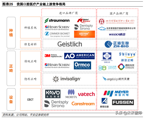 口腔醫(yī)療的上游為耗材和設(shè)備生產(chǎn)商,其中低值耗材由于單品空間有限,廠家眾多,基本以價(jià)格競爭為主,投資價(jià)值有限。我們認(rèn)為在上游重點(diǎn)關(guān)注種植和正畸領(lǐng)域的高值耗材和相關(guān)設(shè)備,這些領(lǐng)域目前均由進(jìn)口品牌主導(dǎo),進(jìn)口替代空間大,且單品市場價(jià)值高。