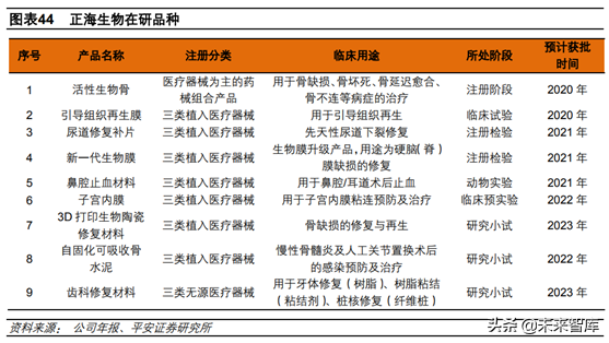 后續(xù)研發(fā)方面,重磅品種活性生物骨注冊獲得藥監(jiān)局受理。活性生物骨屬于藥械組合產(chǎn)品,注冊壁壘較高,公司先發(fā)優(yōu)勢,我們預(yù)計(jì)活性生物骨有在2020年落地。國外擁有活性生物骨產(chǎn)品的企業(yè)以美敦力和史賽克為代表,年銷售額在10億美元以上,且尚未在國內(nèi)上市。除活性生物骨外,公司還啟動(dòng)了引導(dǎo)組織再生膜、新一代生物膜等新產(chǎn)品的梯隊(duì)研發(fā),其中引導(dǎo)組織再生膜在進(jìn)行臨床試驗(yàn),預(yù)計(jì)2020年獲得注冊證,有望成為新的業(yè)績增長點(diǎn);新一代生物膜在注冊檢驗(yàn),預(yù)計(jì)2021年獲得注冊證;另外子宮內(nèi)膜修復(fù)材料是潛在大品種,考慮到人工流產(chǎn)和剖腹產(chǎn)人群龐大,市場規(guī)模比現(xiàn)有品種高出一個(gè)數(shù)量級,預(yù)計(jì)在3-4年內(nèi)拿到注冊證書。其他品種如尿道修復(fù)補(bǔ)片、鼻腔止血材料等有望在2021年獲批。