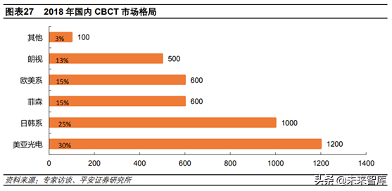 相關(guān)設(shè)備領(lǐng)域主要有口腔CBCT(ConeBeamCT,錐形束CT),與傳統(tǒng)CT相比具有掃描時(shí)間短、空間分辨率高和放射性低等優(yōu)勢。伴隨種植和正畸的快速增長,CBCT的使用越來越多。2012年以前我國口腔CT行業(yè)主要由高品質(zhì)、高性能、高價(jià)格的國外品牌占領(lǐng),包括Kavo、日本Morita、DentsplySirona、科銳等,主要面向病人量大、臨床要求高的公立醫(yī)院。但近年來以美亞光電為首的國產(chǎn)品牌逐漸掌握CBCT的核心技術(shù)并實(shí)現(xiàn)量產(chǎn),成本下降帶動(dòng)價(jià)格下降,國內(nèi)品牌零售價(jià)約30萬元,市場競爭度日趨提高,國外CBCT價(jià)格則不再居高不下,從100萬元以上下降到50-150萬元。2018年美亞光電占國內(nèi)市場份額30%左右,2013年到2017年銷售量年復(fù)合增長率達(dá)到101%,主要面向民營??漆t(yī)院和口腔診所,渠道下沉釋放基層醫(yī)療設(shè)備需求。