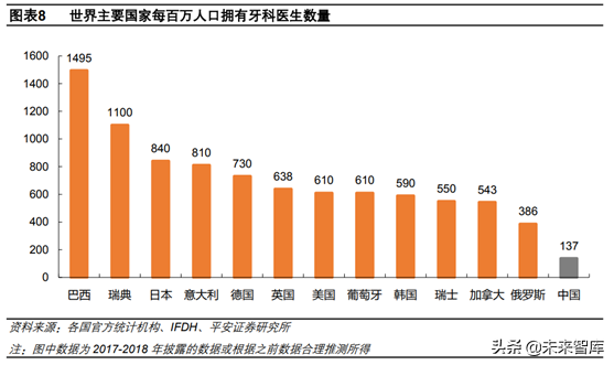 我國口腔醫(yī)師資源稀缺,人均牙醫(yī)數(shù)量與發(fā)達(dá)差距。口腔醫(yī)生是口腔醫(yī)療服務(wù)的實(shí)際提供者,其數(shù)量代表了一個(gè)口腔醫(yī)療資源水平。目前從世界主要來看,發(fā)達(dá)每百萬人口牙醫(yī)數(shù)量大致在500-1000之間。根據(jù)2018年巴西聯(lián)邦牙科委員會(huì)(CFO)數(shù)據(jù),巴西牙醫(yī)數(shù)量已達(dá)到31萬人,每百萬人擁有牙醫(yī)數(shù)達(dá)到1495人,為數(shù)量多的。與我國人種和文化相近的日本和韓國分別達(dá)到840人和590人。而我國僅137人,與上述差距顯著,擁有巨大的提升空間。