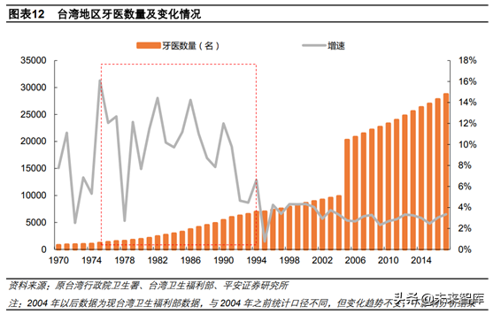 1975-1994是臺(tái)灣地區(qū)口腔醫(yī)療發(fā)展快的20年。我們以口腔醫(yī)師總數(shù)代表口腔醫(yī)療發(fā)展程度,1975-1994這20年是臺(tái)灣地區(qū)口腔醫(yī)生數(shù)量增速快的區(qū)間,CAGR達(dá)到10%。在此期間,臺(tái)灣地區(qū)人均GDP由985美元提升至12160美元。每百萬人口擁有牙科醫(yī)生數(shù)由75人提升至330人。我們認(rèn)為這段時(shí)間臺(tái)灣牙科醫(yī)療發(fā)展迅猛,一是由于這段時(shí)間臺(tái)灣人均GDP快速提升,年復(fù)合增速達(dá)到13%,口腔醫(yī)療消費(fèi)能力大幅提升;二是臺(tái)灣地區(qū)受日韓等影響,以及本地區(qū)對于牙科教育的重視,民眾口腔健康觀念和牙科醫(yī)療服務(wù)水平顯著提升;三是1975年臺(tái)灣實(shí)施《新醫(yī)師法》,賦予了牙科醫(yī)生法律地位,牙科醫(yī)生社會(huì)地位隨之提升。
