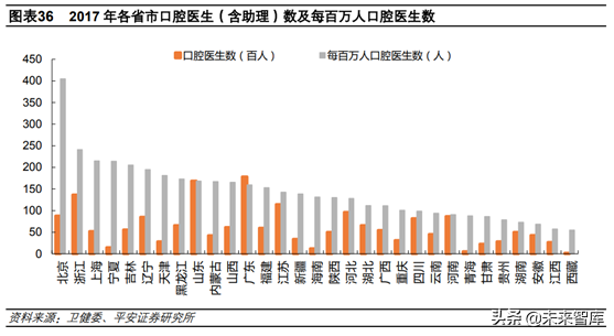 我國一二線城市高口腔醫(yī)生密度可支撐種植和正畸發(fā)展。我國口腔醫(yī)生分布不均,北京以每百萬人擁有405名口腔醫(yī)生高居首位,已超過俄羅斯,接近一般發(fā)達(dá)水平500名的水平。浙江、上海、寧夏、吉林也在200名以上,廣東、山東、江蘇等省的口腔醫(yī)生總數(shù)均在萬名以上。由于高水平口腔醫(yī)院或綜合醫(yī)院口腔科多位于省會(huì)或重點(diǎn)城市,口腔醫(yī)生尤其是高水平口腔醫(yī)生傾向于向大城市集中,杭州、寧波、廣州、深圳、青島、蘇州、南京等城市均具有較高的口腔醫(yī)生密度,保守估計(jì)都在200人/百萬人口以上。我國重點(diǎn)一二線城市已具備較強(qiáng)的口腔醫(yī)療服務(wù)能力,可支撐種植和正畸領(lǐng)域發(fā)展。