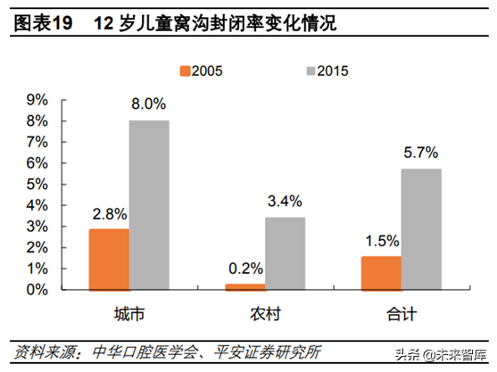 2)居民口腔健康觀念不斷提升。在口腔醫(yī)療潛在需求旺盛,支付能力有的前提下,我國口腔行業(yè)發(fā)展的掣肘因素之一就是居民口腔健康觀念。隨著80、90后成為社會(huì)中堅(jiān)力量,消費(fèi)主力對新事物接受程度提高。根據(jù)近兩次口腔健康流行病學(xué)調(diào)查結(jié)果看,無論是12歲兒童窩溝封閉率還是各年齡段的齲補(bǔ)比例都有顯著提升。