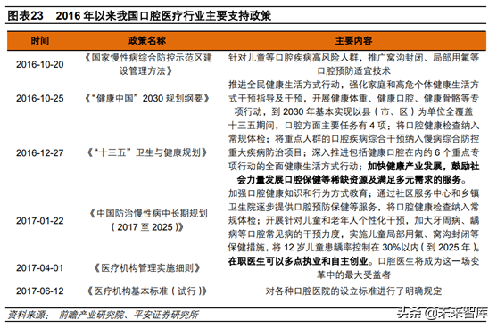 4)近幾年支持政策不斷出臺(tái)。2016年以來我國不斷出臺(tái)口腔行業(yè)相關(guān)支持政策,其中《“十三五”衛(wèi)生健康規(guī)劃》提出的鼓勵(lì)社會(huì)力量發(fā)展口腔保健,以及《醫(yī)療機(jī)構(gòu)管理實(shí)施細(xì)則》提出的在職醫(yī)生可以多點(diǎn)執(zhí)業(yè)和自主創(chuàng)業(yè)顯著利好口腔醫(yī)療行業(yè)發(fā)展。