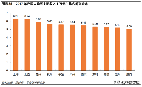 我國主要一二線城市人均可支配收入已經(jīng)達(dá)到或接近9000美元。2017年上海和北京城鎮(zhèn)居民人均可支配收入分別為6.26萬和6.24萬元,按2017年平均匯率計(jì)算分別為9300美元和9200美元。此外,蘇州、杭州、寧波、廣州、南京、深圳等城市均接近9000美元。