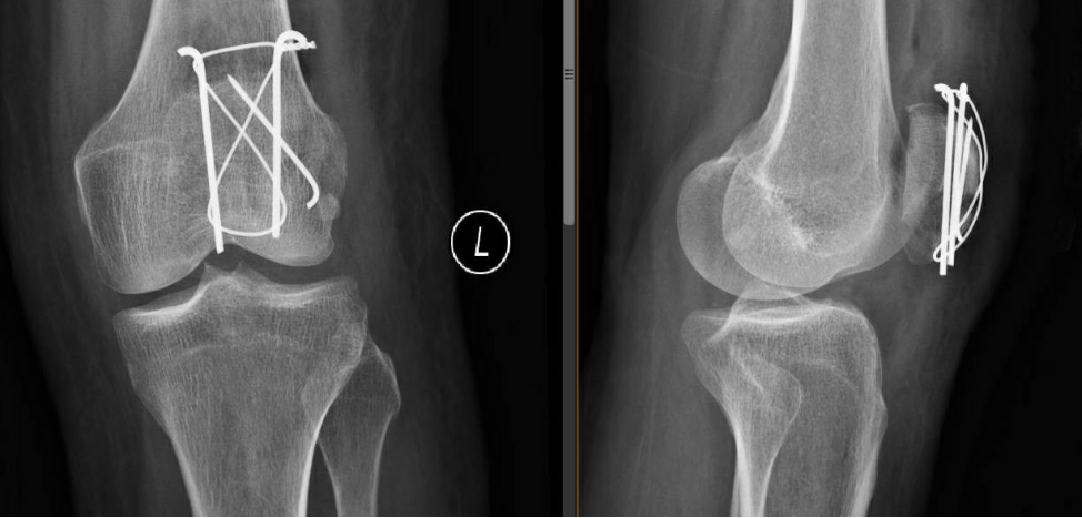 術(shù)后第二天復(fù)查左髕骨X線提示:左髕骨骨折術(shù)后改變,可見金屬內(nèi)固定器影,斷端對(duì)位對(duì)線佳,骨小梁尚規(guī)則,左膝關(guān)節(jié)在位,關(guān)節(jié)間隙尚可。