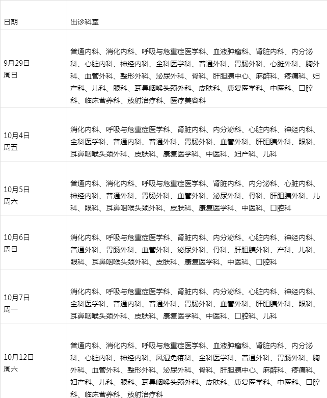 兒科:10月4日、7日上午半日專家門診,10月1日、2日、3日、5日、6日停診;9月29日、10月12日全天專家門診。