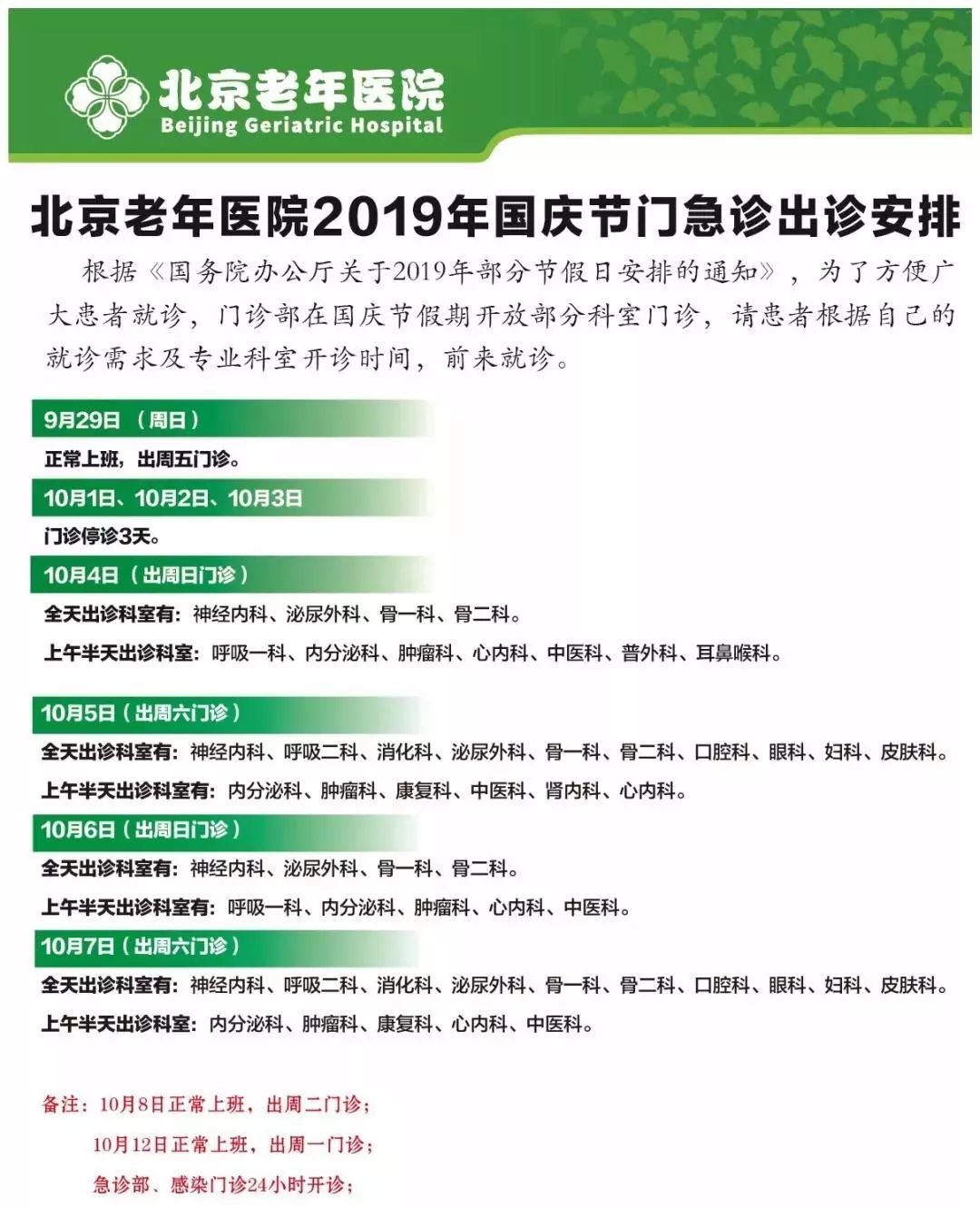 10月1日(國慶節(jié))~10月3日:門診為上午半日門診(綜合科、老年科、乳腺科、內(nèi)分泌科、男科、疼痛科、推拿科、營養(yǎng)門診停診)。